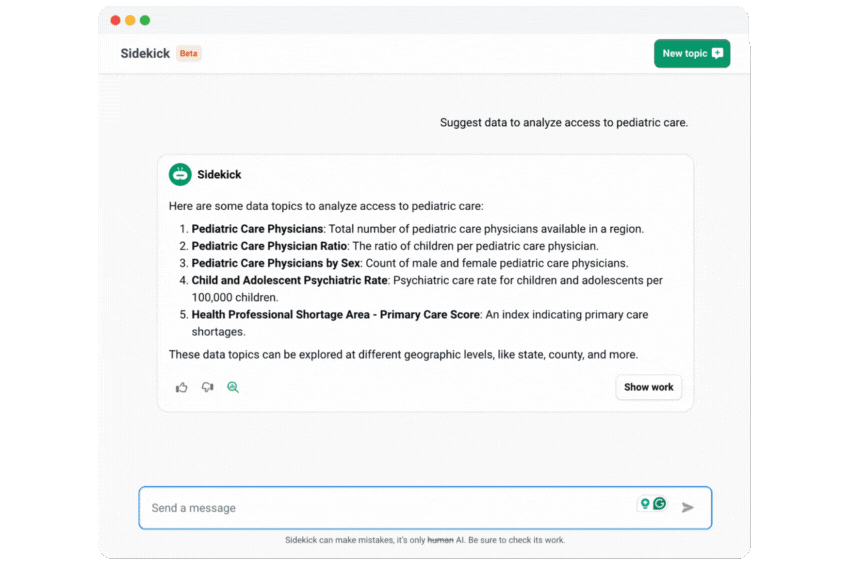 Sidekick helps you explore our robust community data library, build visualizations like maps, and get answers about places, health, and so much more.